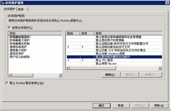 那服务器上会有什么问题呢?是不是什么端口没开呢?不会的,因为服务器上访问外网的端口是全部开放的。而以上的设置根本不用服务器对外提供什么服务,当然也就不用开放什么端口了。各种情况排除之后,那就对了,肯定是服务器上的杀毒软件或者防火墙阻止掉了。服务器上安装的正好是Mcafee,这个杀毒软件会让服务器多一些莫名其妙的问题。当然我不是说它不好,我觉得服务器上安装这个杀软还是不错的选择,防御方面非常不错。